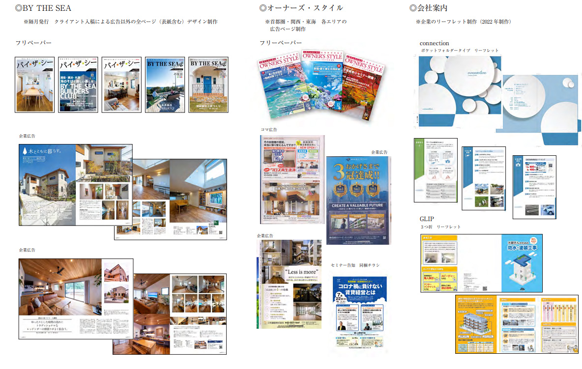 販促チラシ、会社案内パンフレット、ポスター、商品カタログ、名刺デザイン、店頭POP、DM、パッケージデザイン