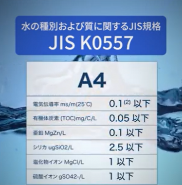 JIS K0057(水の種別および質に関する日本工業規格)の最高グレード「A4レベル」をクリアしている点も信頼の証です。